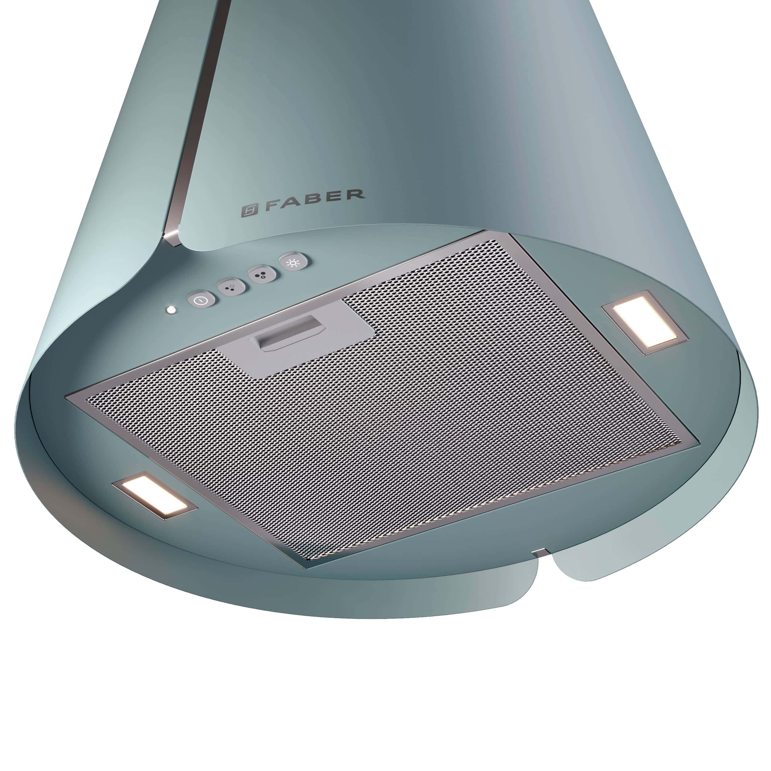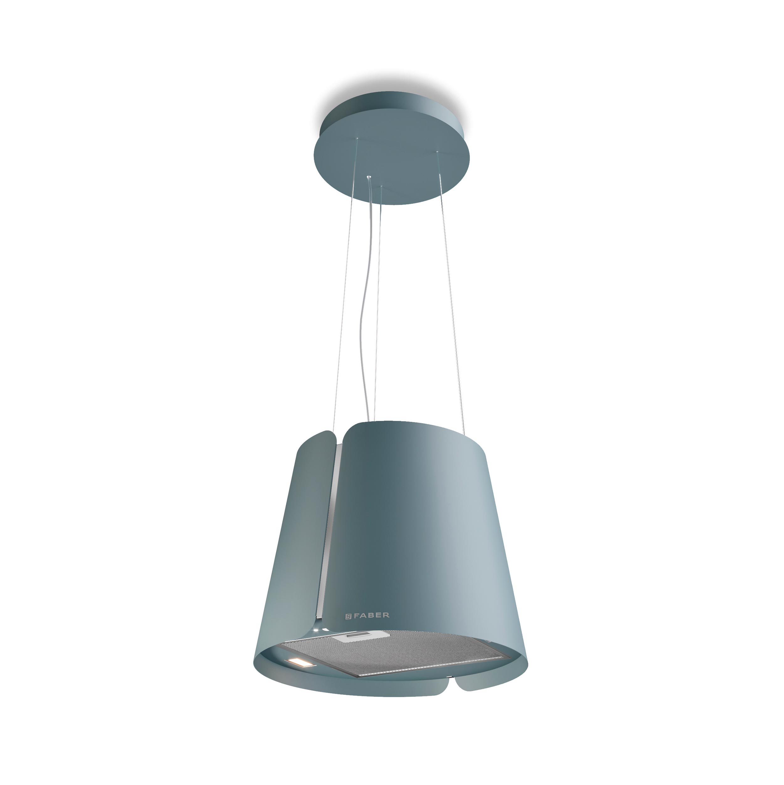 Freestanding wire-hung hood with internal motor & recirculation filter – Dusty Blue matt – Ø430 mm – A