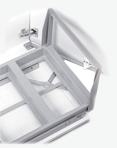 Door mechanism for Eico 2SK and 3SK. Waste bins slide out when the cabinet door is opened. Fits both right- and left-hinged doors.