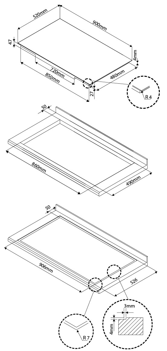 - Built-in (WxDxH): 860 x 490 x 47 mm